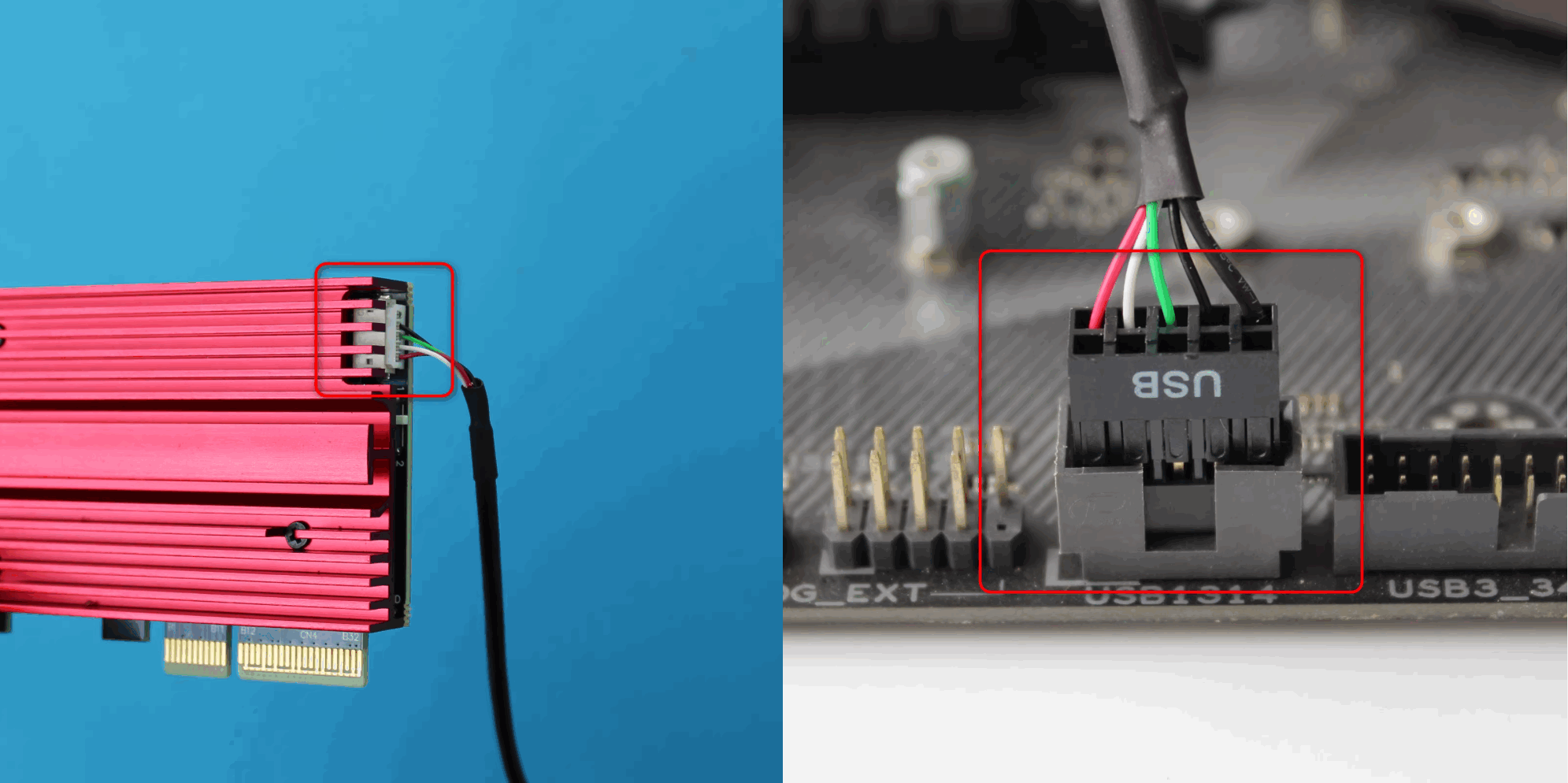 2. Use the included five-pin Bluetooth cable to connect the wireless card. Connect the other end of the Bluetooth cable to the nine-pin USB port on the motherboard.