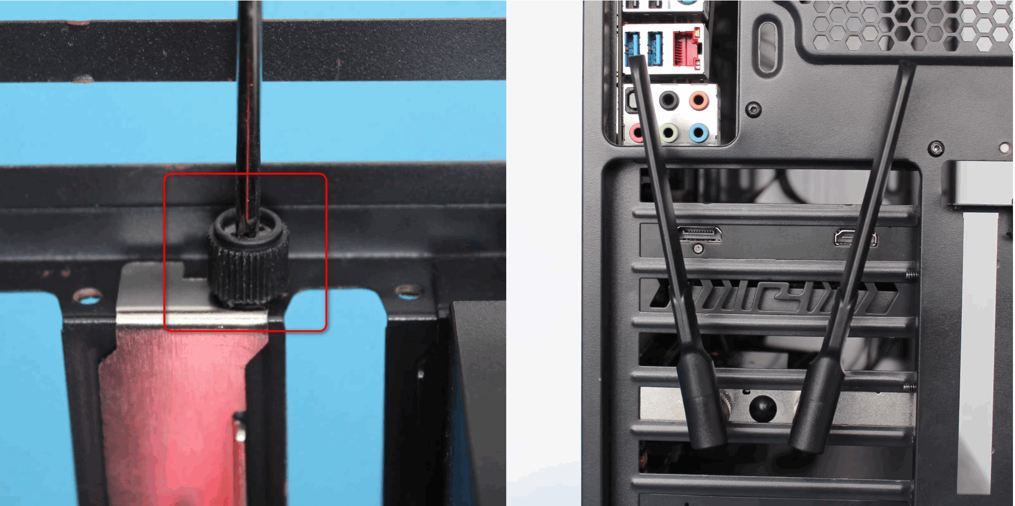 3. Secure the network card to the case with screws. Finally, screw the antenna onto the card.